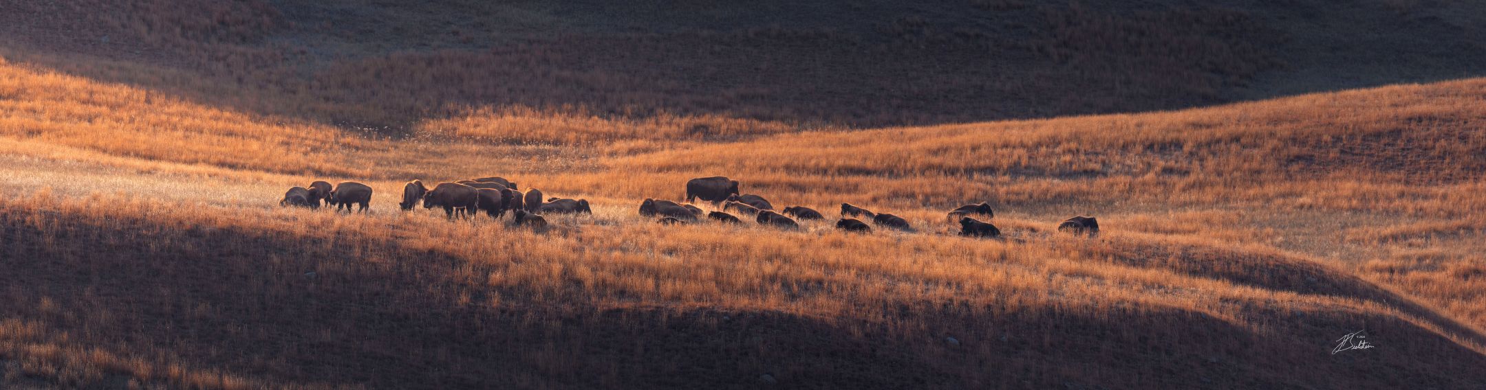 A peaceful panorama of a bison herd resting across the golden, sunlit hills of Custer State Park during the warm glow of sunset.