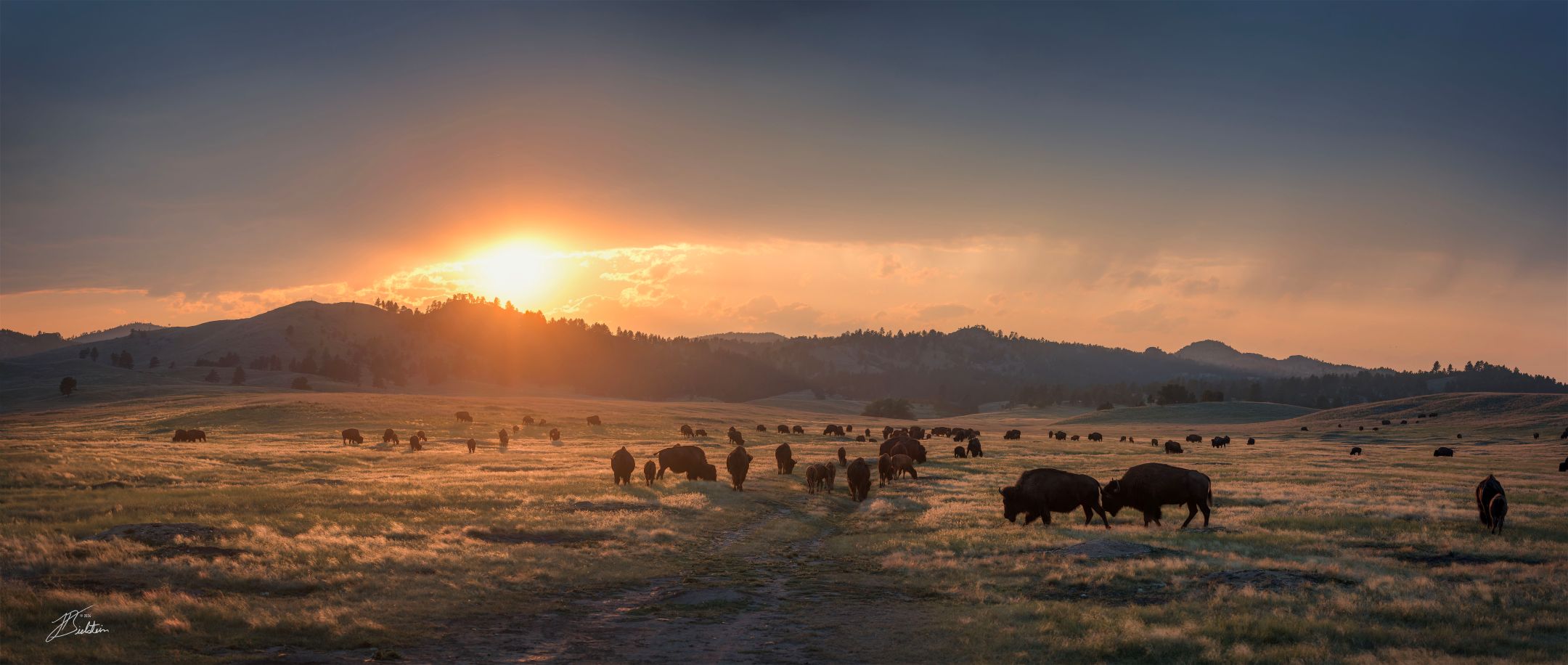 A vast herd of bison grazes across the rolling plains of the Black Hills as a dramatic sunset dips behind the silhouetted hills.